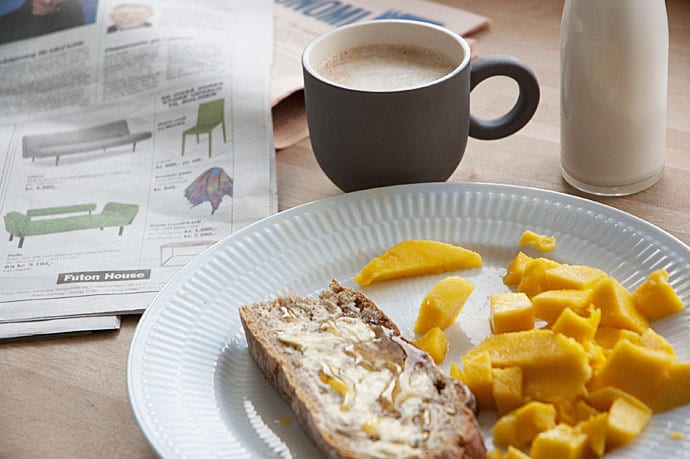 Vi har også planer om at shoppe hjemmesko til børnehavebrug og til herhjemme. Julie ønsker sig prinsessehjemmesko, og jeg ved at ballarinaer med glimmer vil være et stort hit hos hende. Til morgenmaden i dag, har vi spist mango og det sidste rosmarin grydebrød med smør og honning. Drukket latte og te og siddet stille i sofaen og kigget på regnvejret udenfor.