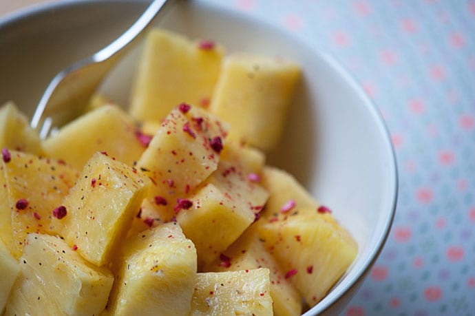 I håb om solskin og forår starter jeg dagen med solgule ananastern drysset med frysetørret hindbær. Sent i seng og tidligt op, så skal kroppen lige kickstartes med energi. Blogindlægget bliver lidt kort for jeg står med det ene ben ude af døren – og har haft et par travle dage, inkl dagen i dag. Jeg håber snart, at kunne løfte sløret for en spændende deadline, som jeg har arbejdet med de sidste dage – forhåbentlig på bloggen i morgen.
