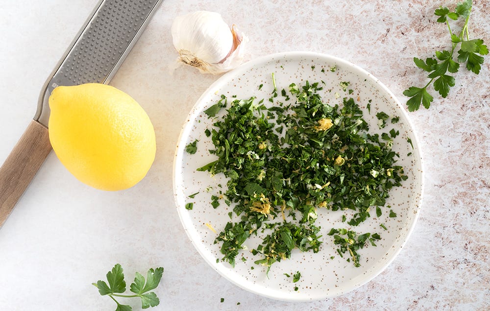 Den finthakkede persille med hvidløg og citron er så enkel og kan gøre en stor forskel for måltidet. Gremolata giver en dejlig smag, krydret, med en smule en smule syrlighed og er duftende aromatisk. Perfekt afslutning til mange retter. Prøv fx også at drysse lidt gremolata over en skål med kogte nye kartofler vendt i lidt smør, det smager forrygende.