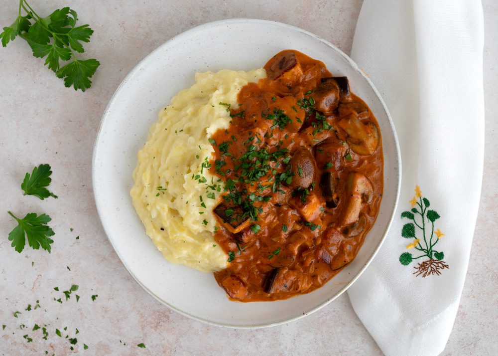 Halloumi Stroganoff med kartoffel- og blomkålsmos er virkelig lækkert og en af de dejlig gryderetter, som smager vidunderligt fyldigt, mættende, nærende og ligger godt i maven.