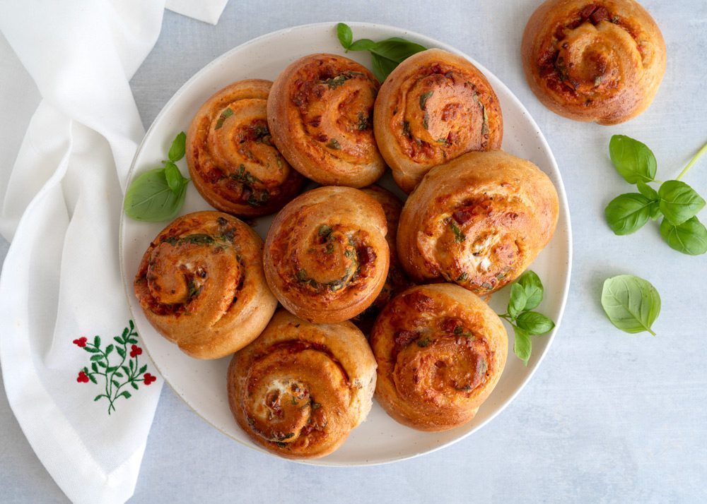 Som variation kan man evt. smøre pesto eller artiskokcreme ud på hele dejen i stedet for tomatpuré og så tilsætte cherrytomater til fyldet :)