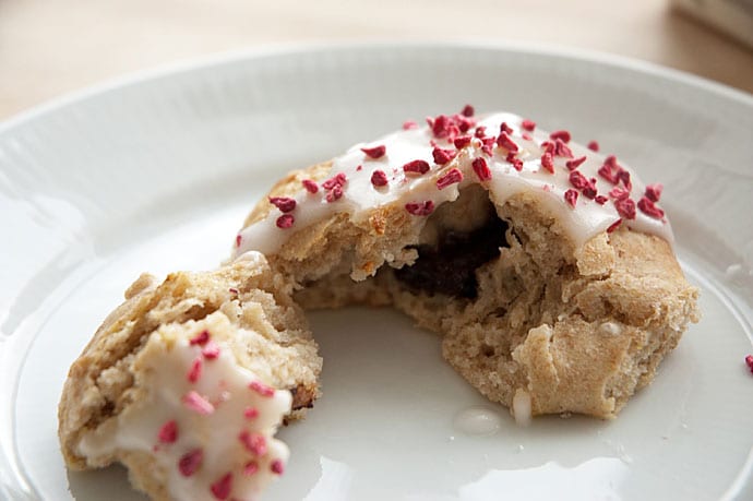 Bollerne med chokolade overraskelse pyntede jeg med hvid glasur og frysetørrede hindbær. (er der nogen af jer, der ved hvor man kan købe det henne i Aarhus? Kender flere gode steder i Kbh, men kan ikke finde det her i byen)