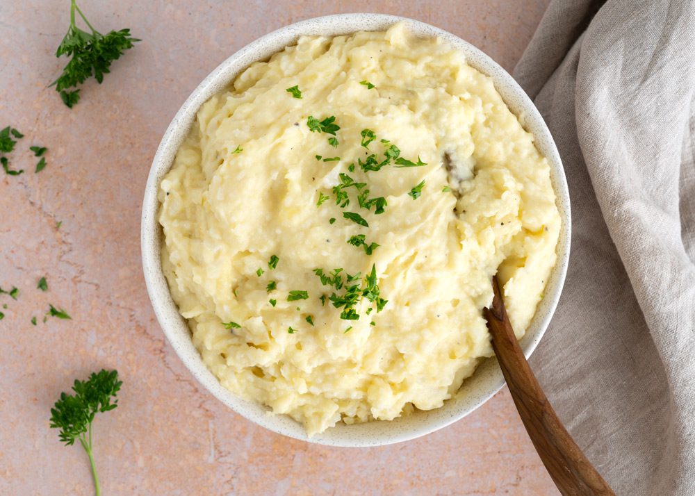 Mos kartofler og blomkål med smør og pisk derefter kartoffelmosen ved lav hastighed med lun mælk lidt efter lidt, til konsistensen er luftig og cremet. Smag til med salt og peber.