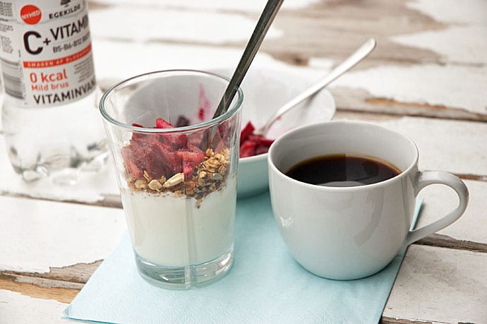 Forleden dag lavede jeg denne lille eftermiddagstreat til børnene og jeg. Min søde mor havde været forbi i sommerhuset med flere af de delikate og fine vinrabarber. De blev lavet til endnu engang rabarberkompot og sammen med lidt hjemmelavet granola og 1/2 skyr – 1/2 drænet ymer blev det til en fabelagtig snack. Næsten som en rabarbertrifli, men langt fra lige så kalorieholdig.