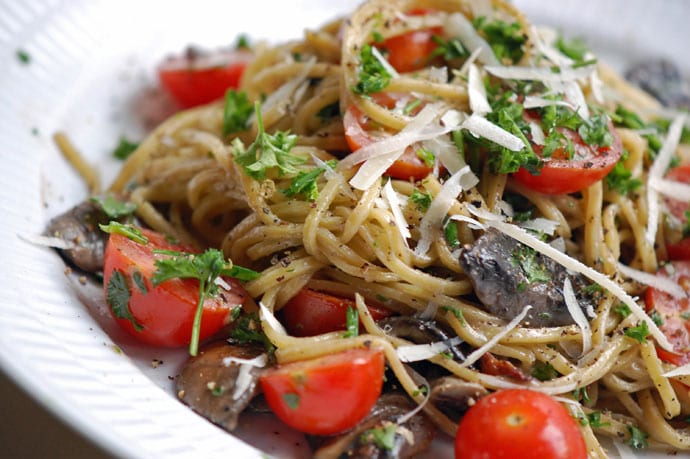 I går aftes var jeg alene med børnene til aftensmaden, så vi biksede lige noget nemt og sjovt sammen. Sådan en pastasauce af ting vi kan lide: pølsestykker fra den gode øko fra Ålbæk slagteren (den der kan købes i netto og som er god til pålæg) løg, tomat på dåse, lidt krydderier, æblestykker. Serveret med frisk pasta, groft revet pecorino, et drys af den bredbladede persille, lidt cashew nødder og intet andet. Det er sådan en ret, som vi variere i det uendelige og som aldrig låser sig fast. Den er hurtig og nem (færdig på 10 minutter) og den smager bare altid godt!