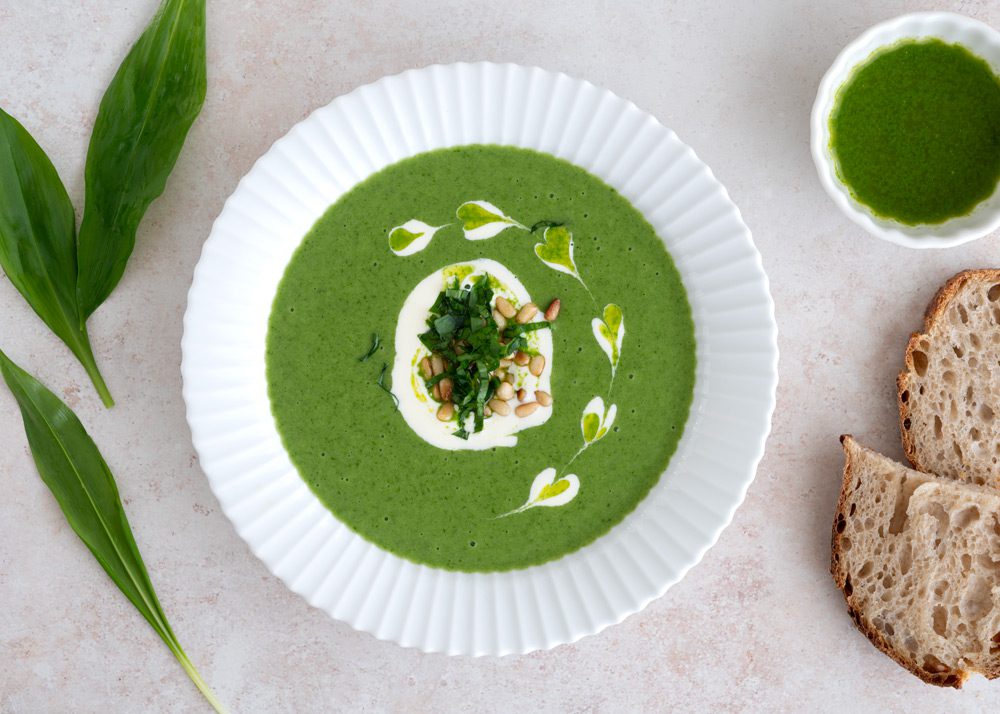 Cremet ramsløgssuppe med kartofler og toppet med en lækker ramsløgspuré og pinjekerner.