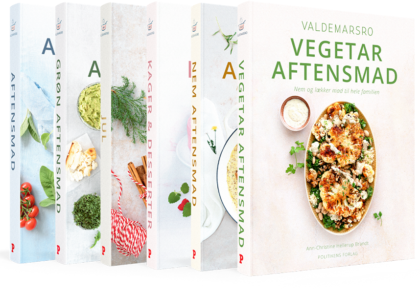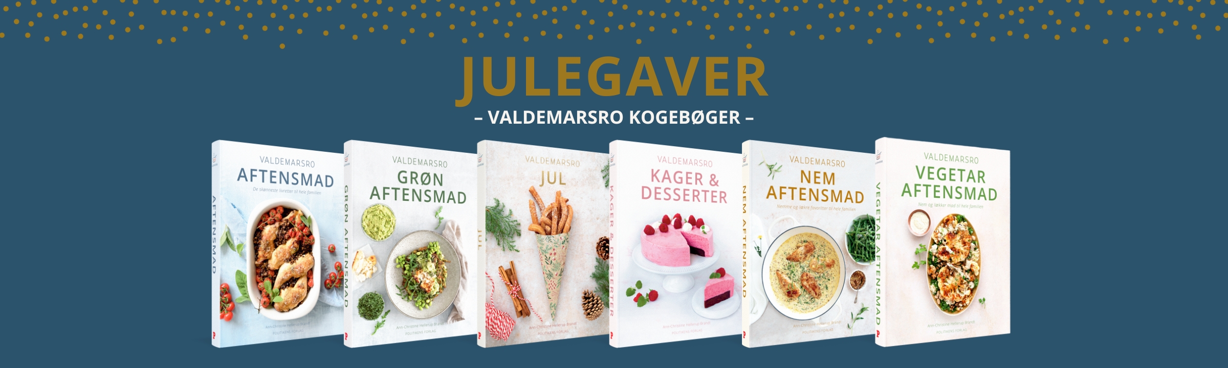 Her er alle kogebøger fra Valdemarsro, og du kan klikke ind og læse om hver bog. Der er links til boghandlerne, og det er også her du har mulighed for at købe en signeret bog med en hilsen til modtageren, det er en sød personlig gave at give.