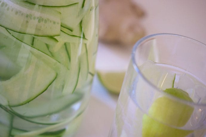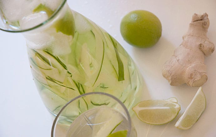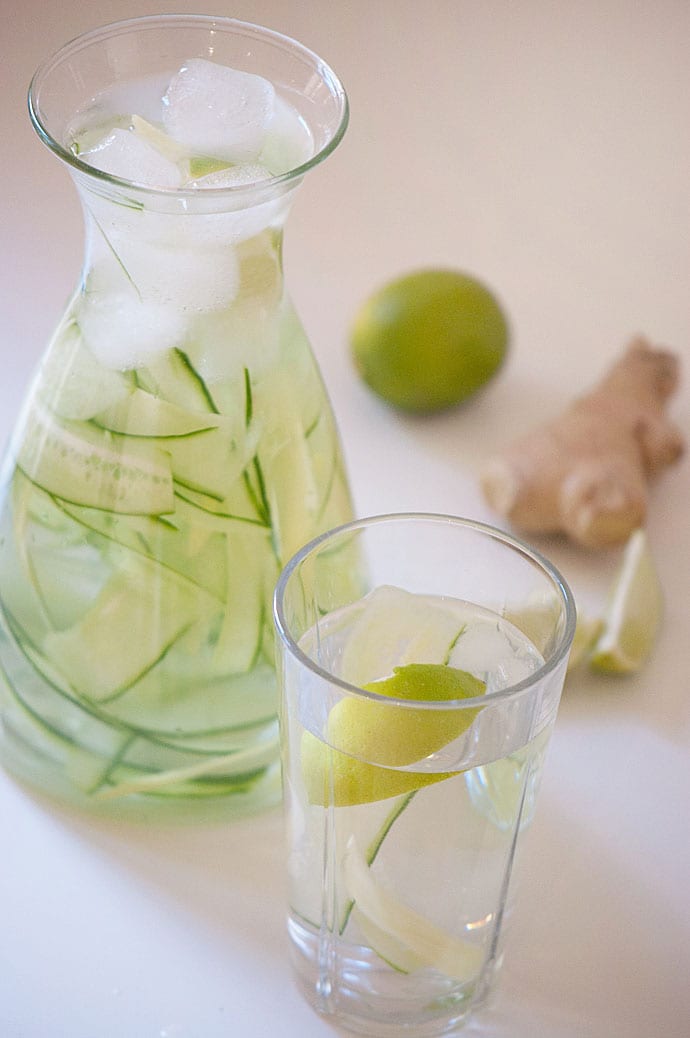 Vandet her er en af mine favoritsommerdrikke. Kølende, mild og sund. Jeg har skåret en halv agurk i tynde skiver med en tyndskræller, det samme med lidt ingefær, og lime i både. Postevand og masser af isterninger. Og så fylder jeg nyt vand og isterninger på i løbet af dagen, efterhånden som jeg drikker det.