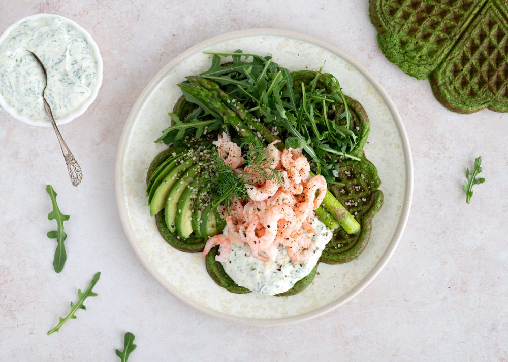 Opskrift på lækre spinatvafler med rejer og avocado. Jeg serverer dem som et komplet måltid med lidt salat, lidt laks, nogle asparges og en cremet urtedressing, som smager særligt fantastisk til rejer og fisk.