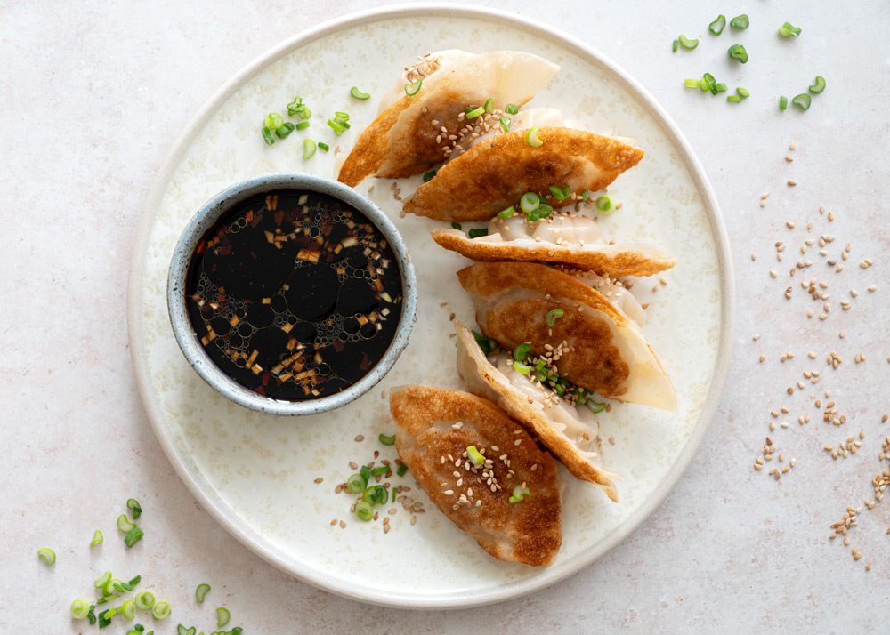 Server gyoza med dipsauce og et drys ristede sesamfrø